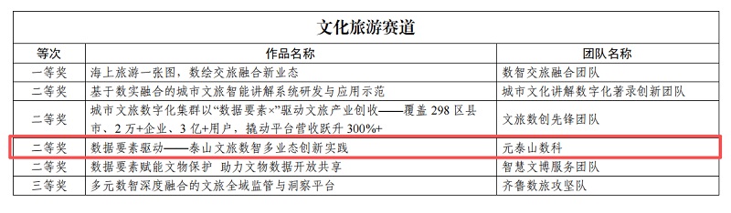 近日,由山東省大數(shù)據(jù)局、中共山東省委網(wǎng)絡安全和信息化委員會辦公室、共青團山東省委等多部門聯(lián)合主辦的2025年“數(shù)據(jù)要素×”大賽山東分賽圓滿落幕。泰山文旅集團子公司元泰山數(shù)字科技有限責任公司憑借“數(shù)據(jù)要素驅(qū)動——泰山文旅數(shù)智多業(yè)態(tài)創(chuàng)新實踐”項目,從眾多參賽作品中脫穎而出,獲文化旅游賽道二等獎。
